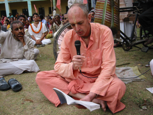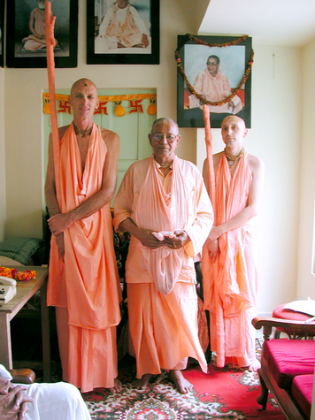 На указанном ниже фото — Бхарати Махарадж справа — тот что не такой высокий. В центре — Гурудев, Шрила Говинда Махарадж, а слева, высокий, — Сиддханти Махарадж.