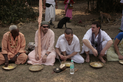 Оба в одежде типа дхоти, но не в шафране, не в одежде санньяси. Вот они стояли в обнимку и молчали. Стояли и молчали, смотря не друг на друга, а куда-то в сторону — отсутствующими взглядами. Я как бы проходил мимо и почему-то левой рукой дотронулся до локтя Сиддханти Махараджа и потом до своего лба, просто выразив почтение… А позже — подошёл к ним и обнял их. И просто растворился в чувстве любви. Просыпался под песню Битлз в своей голове — All You Need Is Love (Любовь — это всё, что тебе нужно).