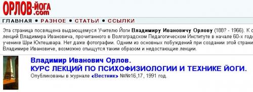 О сайте: Эта страница посвящена выдающемуся Учителю Йоги Владимиру Ивановичу Орлову (188? — 1966). К сожалению, за исключением первой половины приведенного здесь курса лекций Владимира Ивановича, прочитанного в Волгоградском Педагогическом Институте в начале 60-х годов, нам мало что известно об этом замечательном человеке, вероятно, ученике Шри Юктешвара. Нет даже фотографии. Одним из основных побуждений при создании этой страницы была надежда, что посетители помогут нам найти что-то новое о Владимире Ивановиче, возможно отыщутся таким образом и недостающие лекции.